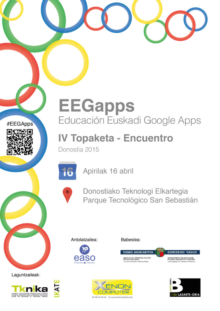 | Apirilaren 16an, Gipuzkoako Zientzia eta Teknologia Parkean, Donostian, Euskadiko Google Apps Hezkuntzako IV. Topaketa ospatuko da. Topaketa honetan, bere 4. edizioan EASO Politeknikoak antolatua, Euskadiko ikastetxetan garatzen ari diren hainbat esperientzia aurkeztuko dira. Gainera, bertan Lanbide Heziketako Sailburuordearen, Jorge Arevalo Turrillasen eta Google Apps Hezkuntzako ordezkari europar baten presentzia izango ditugu, besteak beste. Topaketa irakasleentzat eta oro har ikaste-irakaste prozesuetan, ikaskuntzaren kudeaketan edo zentroak kudeatzeko Google Apps Hezkuntzako tresnak erabiltzeko interesa duten guztientzat dago zabalik. Egitaraua zein izen-emate orria topaketaren web orrian dituzue eskura.