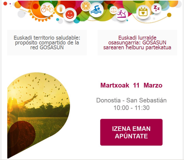 | Easo Politeknikoko irakaslea den Xabi Gonzalezek “Euskadi lurralde osasungarria: GOSASUN sarearen helburu partekatua” jardunaldian parte hartuko du ikastetxeko easOngizatea programa aurkeztuz. Jardunaldi honetan, laneko, komunitateko eta hezkuntza arloko inguruneetan ohitura osasungarriak bultzatzeko gakoak Osalan, Irungo Udala eta UPV/EHU-ren eskutik ezagutuko ditugu. Gainera GOSASUNeko eragile ezberdinek esperientzia berritzaile batzuk kontatuko dizkigute: Bilboko Portuko Agintaritza, Easo Politeknikoa, Guggenheim Bilbao edo Projekta Urbes. Talent House (Donostian) Martxoak 11, 10:00etik 11:30etara Izena emateko jarraitu esteka hau.