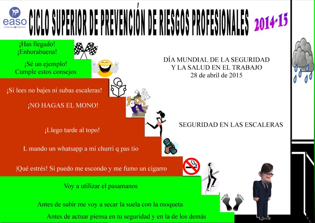 | El día 28 de abril se celebra el Día Mundial de la Seguridad y la Salud en el Trabajo. Siendo Politécnico EASO el único centro de Formación Profesional que ofrece el ciclo formativo de Prevención en Riesgos Profesionales en Gipuzkoa, no hemos querido perder la oportunidad de que el evento esté presente en el centro este día. Contaremos con la presencia de Ander Arrieta Abásolo, técnico PRL que trabaja en Osalan, para hablar del mundo de la prevención de riesgos en el trabajo, algo que sin duda es cosa de todos. Esta charla y su posterior debate será de 9:30 a 11:00 de la mañana y está abierta a cualquiera que esté interesado en el tema. Además, los alumnos y alumnas del ciclo de prevención, han preparado unos carteles dirigidos a promover los comportamientos seguros en el centro.