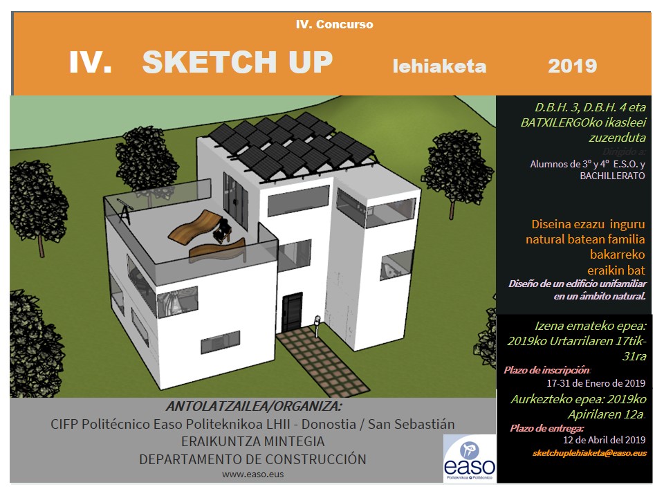 | Un año más el departamento Edificación y Obra Civil de EASO Politeknikoa pone en marcha el concurso de SketchUp dirigido a alumnos y alumnas de 3º y 4º curso de la ESO y bachillerato. Los participantes deberán desarrollar el diseño de una vivienda unifamiliar, sobre una plantilla que se les entregará una vez realicen su inscripción de este formulario siguiendo las bases del concurso que también se les hará llegar. Plazo de inscripción: del 17 de enero al 1 de febrero Formulario de inscripción