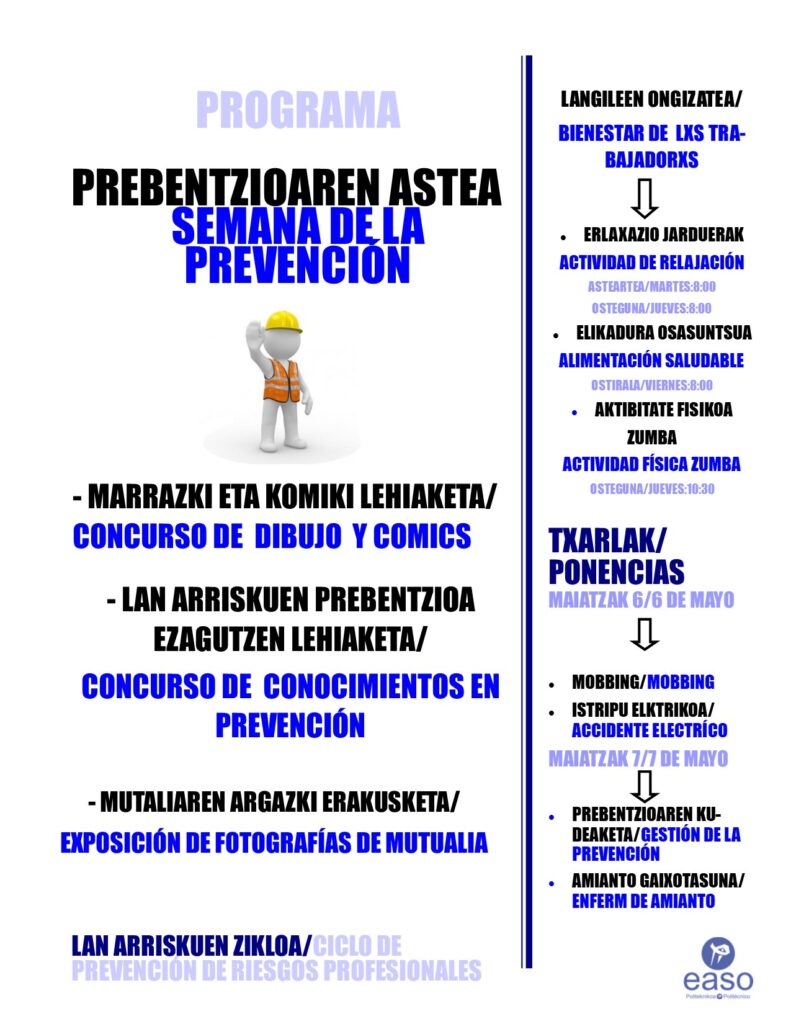 El día 28 de abril, EASO Politeknikoa y, especialmente, el alumnado y profsorado del ciclo superior Prevención de Riesgos Laborales, celebramos el Día Mundial de la Seguridad y la Salud en el Trabajo. Por ello hemos organizado un amplio programa de actividades con el fin de inculcar la cultura preventiva en EASO Politeknikoa y a la sociedad en general.